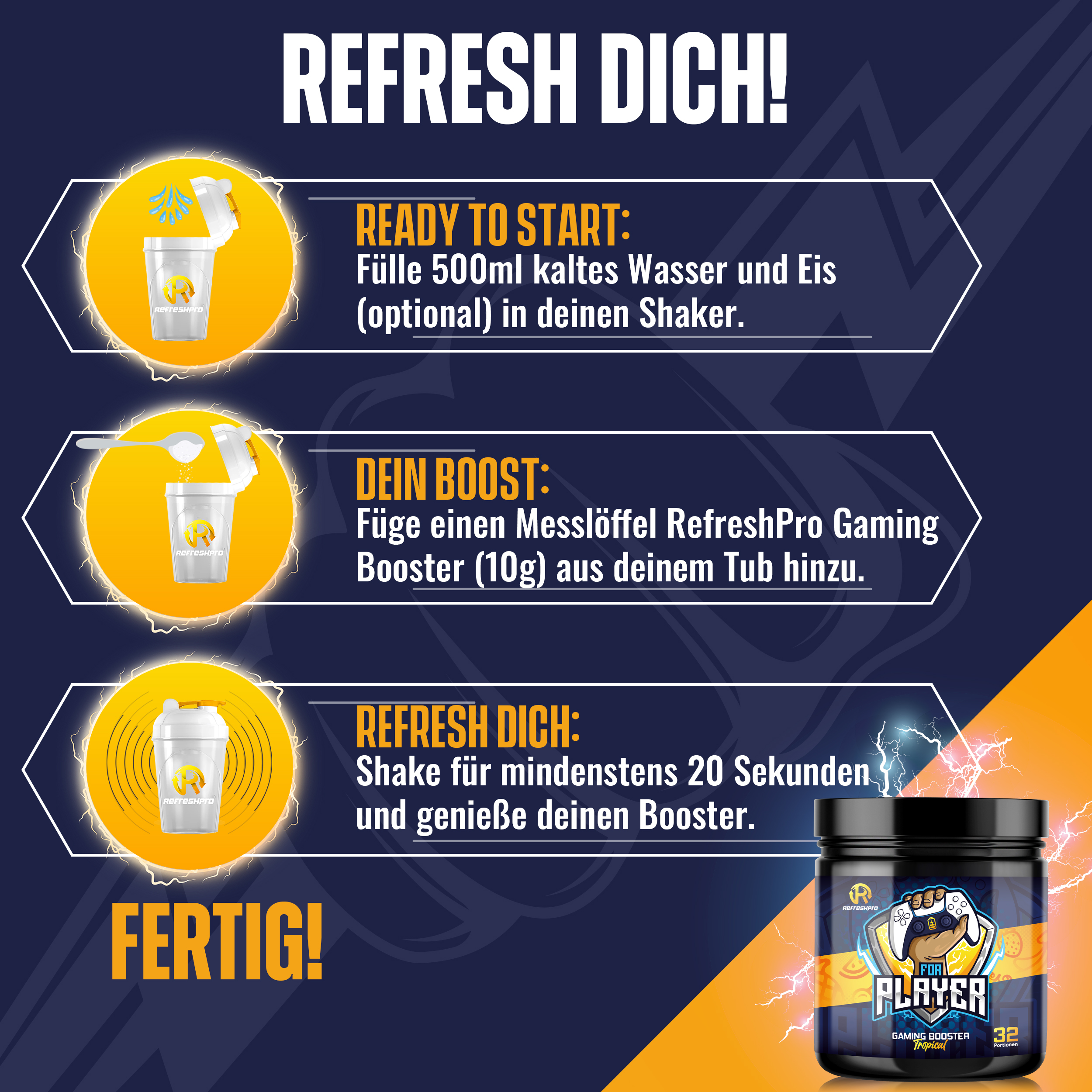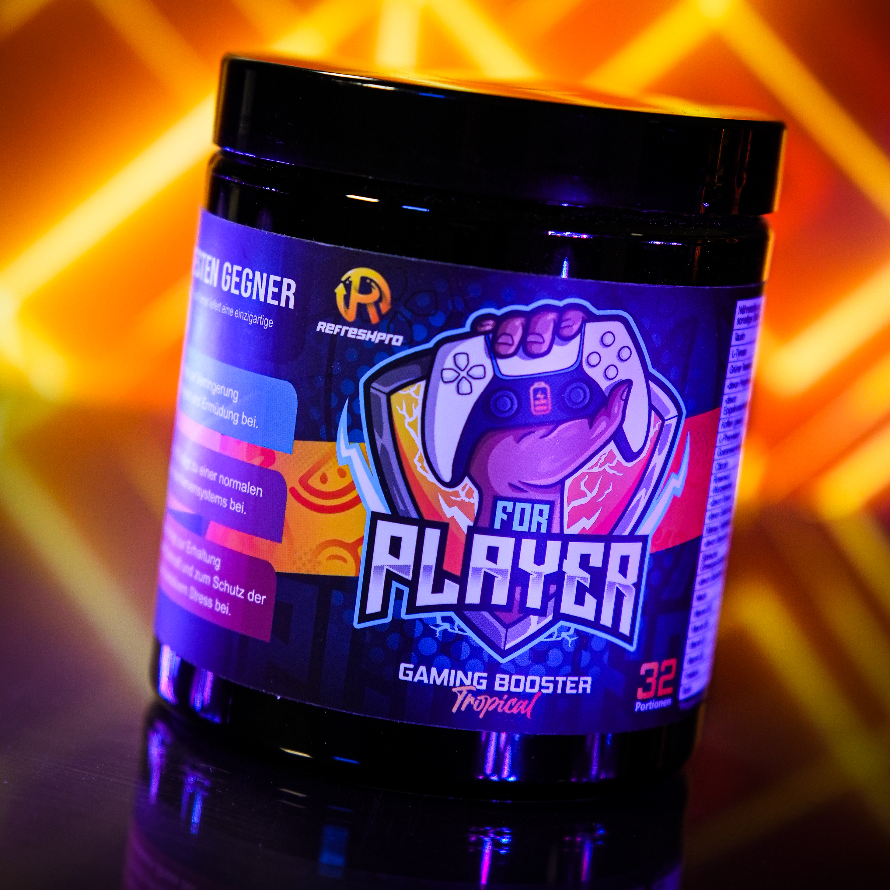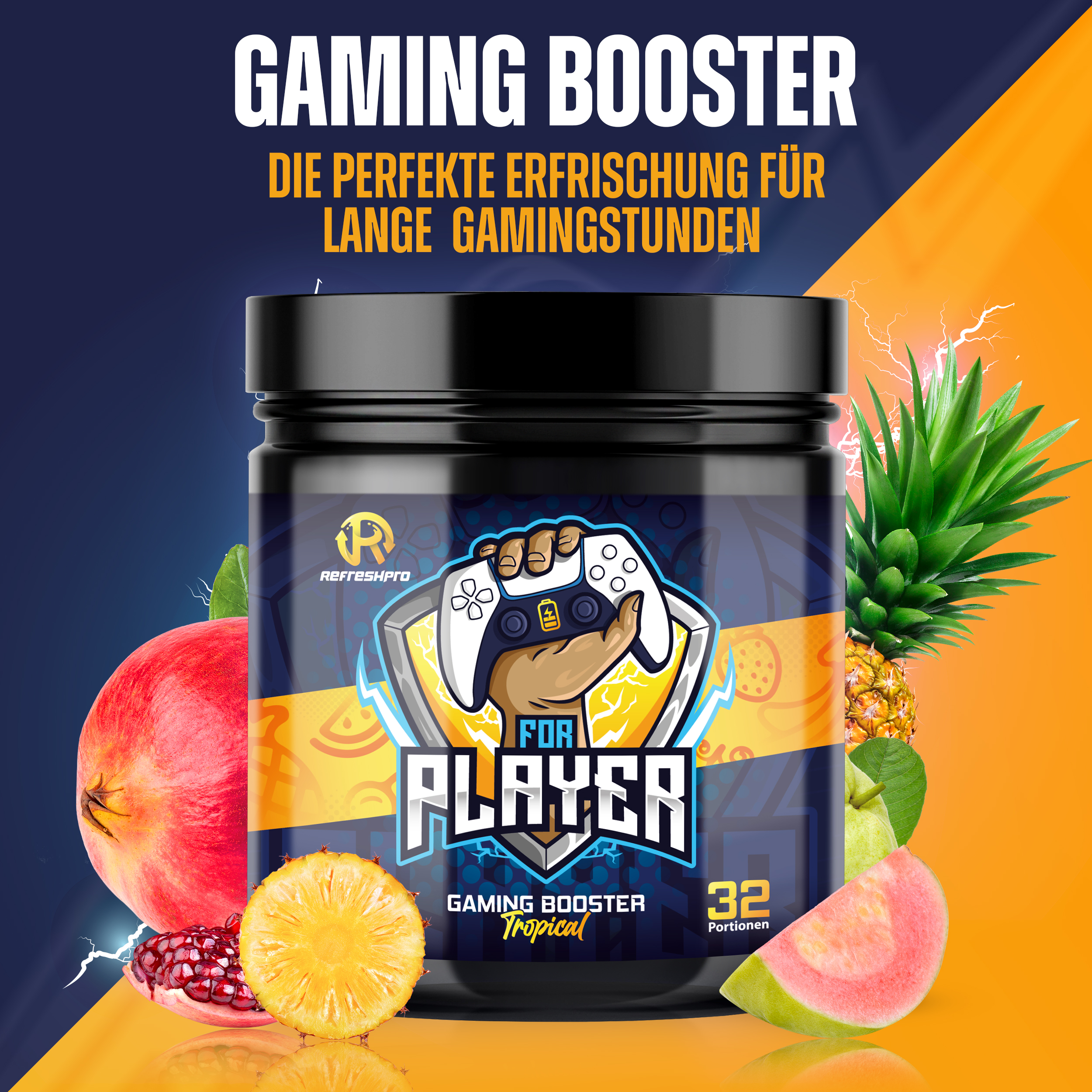 Unser erster RefreshPro - FOR PLAYER Booster ist der perfekte Gaming-Booster für dich! Er bietet nicht nur einen einzigartigen Geschmack, sondern auch eine leistungsstarke Formel, die speziell auf die Bedürfnisse von Gamern zugeschnitten ist. Der tropische Früchte-Mix des FOR PLAYER Booster sorgt für ein erfrischendes und exotisches Geschmackserlebnis. Egal, ob du Ananas, Mango, Passionsfrucht oder andere tropische Früchte bevorzugst, dieser Booster wird dich mit seinem Geschmack begeistern. Neben dem großartigen Geschmack bietet der FOR PLAYER Booster auch eine Vielzahl von Vorteilen für Gamer. Er verbessert deine Fokussierung und Konzentration, sodass du dich voll und ganz auf dein Spiel konzentrieren kannst. Außerdem unterstützt er deine Ausdauer, damit du länger spielen kannst, ohne müde zu werden. Ein weiterer Vorteil des FOR PLAYER Booster ist, dass er weniger Zucker enthält. So kannst du dich auf das Spiel konzentrieren, ohne dir Sorgen um einen möglichen Zuckerkick oder einen Energieschub zu machen, der dich später abflauen lässt. Gib deinem Gaming-Erlebnis mit dem FOR PLAYER Booster den Extra-Boost, den du brauchst! Genieße den tropischen Früchte-Mix, verbessere deine Fokussierung und Konzentration, steigere deine Ausdauer und Reaktionsfähigkeit - und das alles mit weniger Zucker. Hol dir jetzt den RefreshPro for Player und erlebe Gaming auf einem neuen Level!