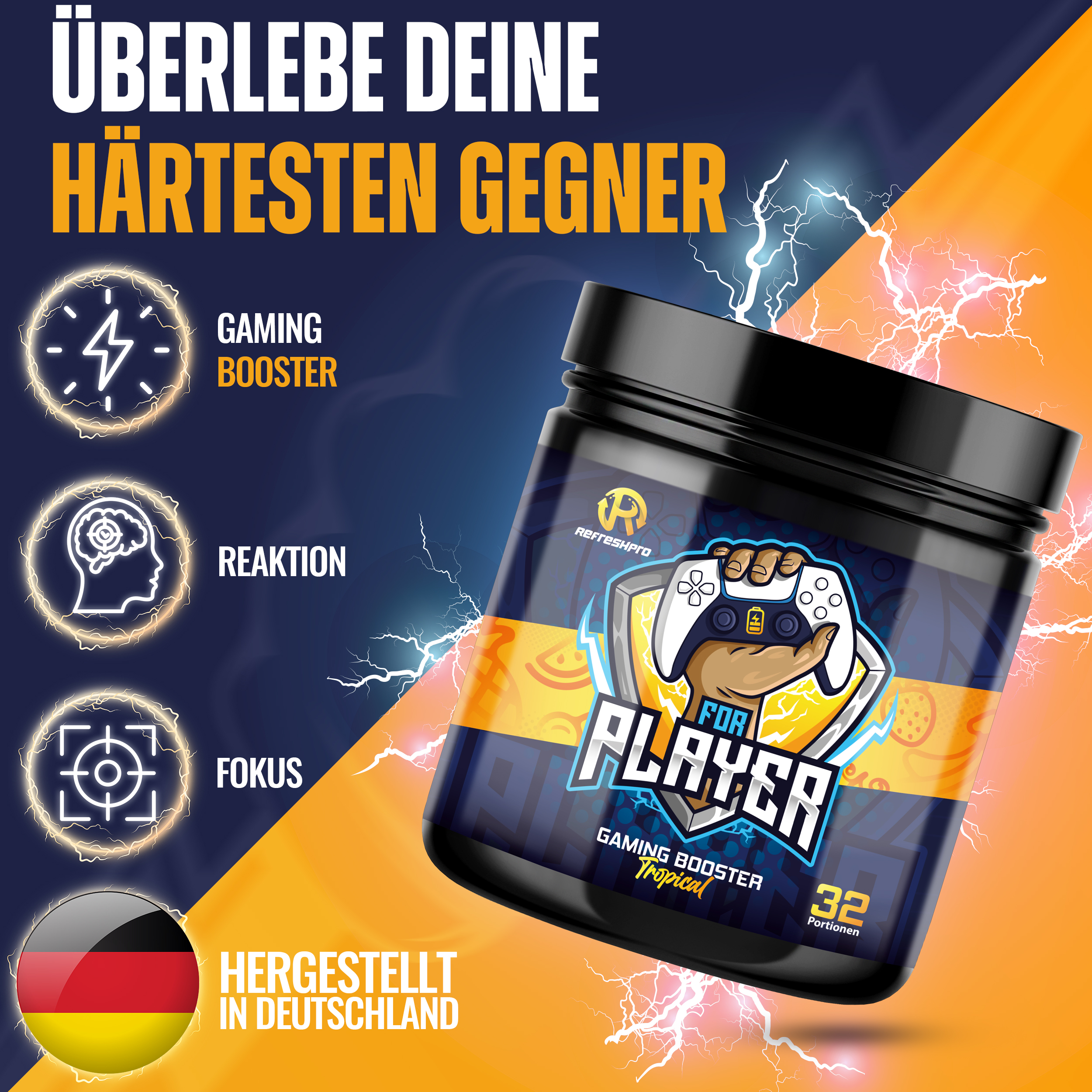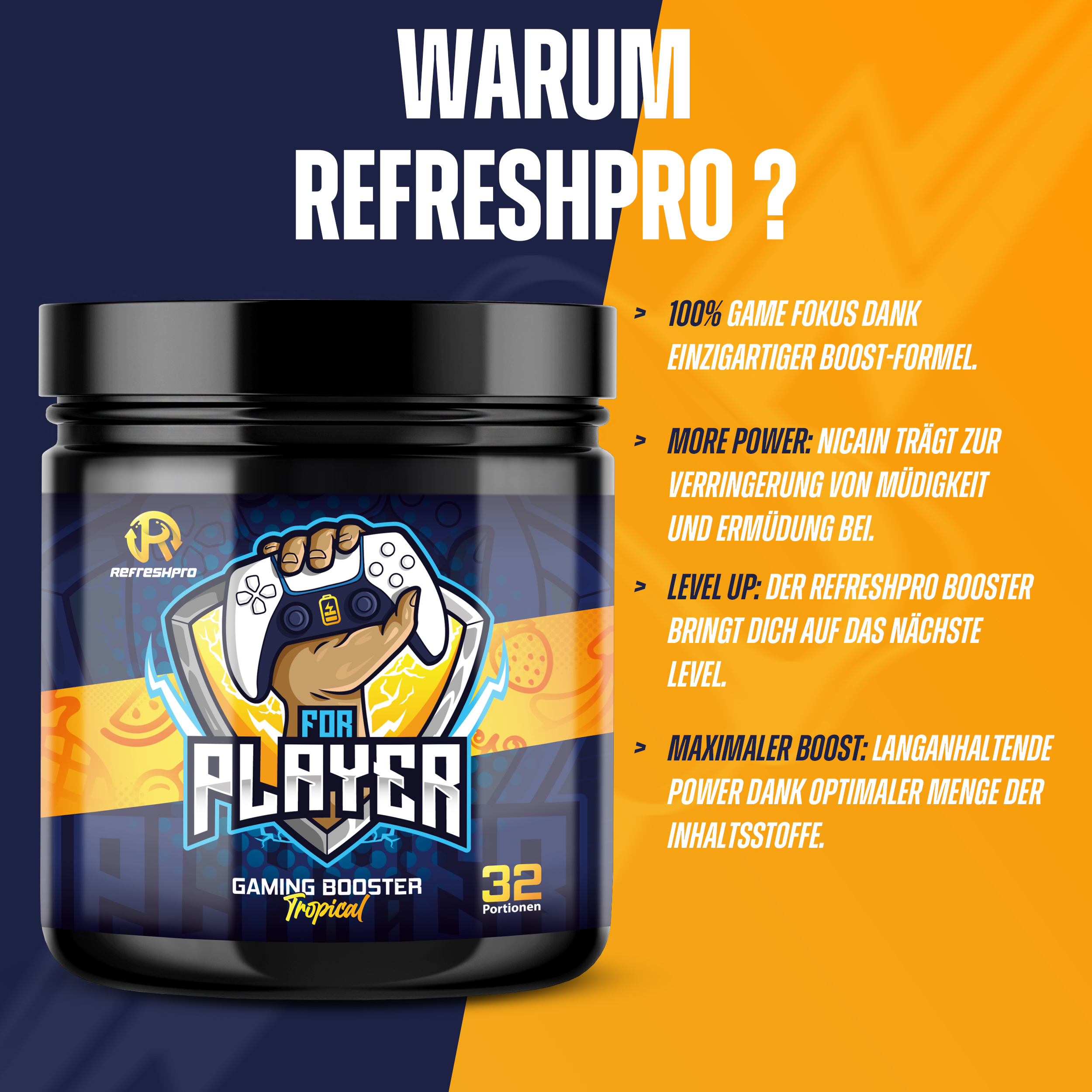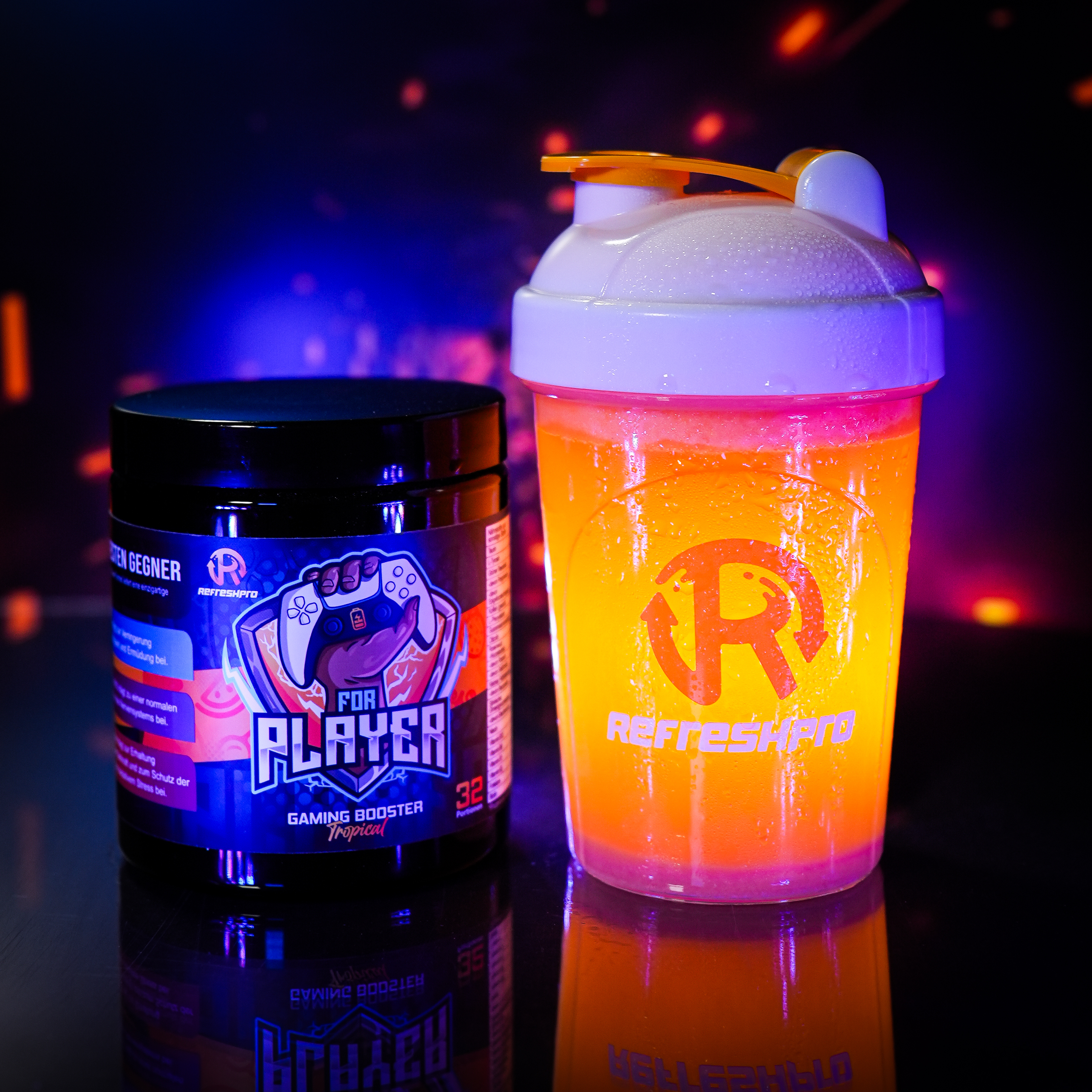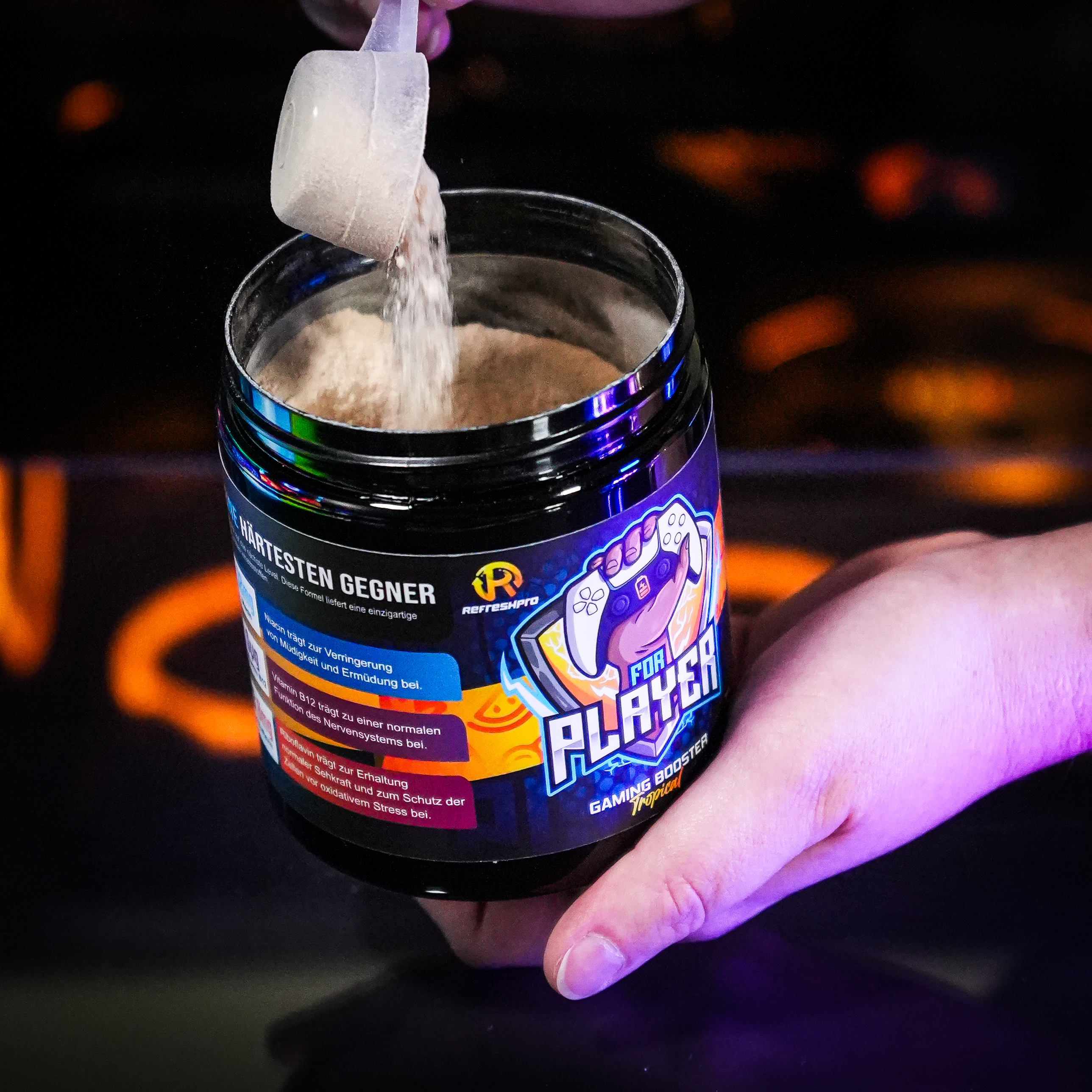 Unser erster RefreshPro - FOR PLAYER Booster ist der perfekte Gaming-Booster für dich! Er bietet nicht nur einen einzigartigen Geschmack, sondern auch eine leistungsstarke Formel, die speziell auf die Bedürfnisse von Gamern zugeschnitten ist. Der tropische Früchte-Mix des FOR PLAYER Booster sorgt für ein erfrischendes und exotisches Geschmackserlebnis. Egal, ob du Ananas, Mango, Passionsfrucht oder andere tropische Früchte bevorzugst, dieser Booster wird dich mit seinem Geschmack begeistern. Neben dem großartigen Geschmack bietet der FOR PLAYER Booster auch eine Vielzahl von Vorteilen für Gamer. Er verbessert deine Fokussierung und Konzentration, sodass du dich voll und ganz auf dein Spiel konzentrieren kannst. Außerdem unterstützt er deine Ausdauer, damit du länger spielen kannst, ohne müde zu werden. Ein weiterer Vorteil des FOR PLAYER Booster ist, dass er weniger Zucker enthält. So kannst du dich auf das Spiel konzentrieren, ohne dir Sorgen um einen möglichen Zuckerkick oder einen Energieschub zu machen, der dich später abflauen lässt. Gib deinem Gaming-Erlebnis mit dem FOR PLAYER Booster den Extra-Boost, den du brauchst! Genieße den tropischen Früchte-Mix, verbessere deine Fokussierung und Konzentration, steigere deine Ausdauer und Reaktionsfähigkeit - und das alles mit weniger Zucker. Hol dir jetzt den RefreshPro for Player und erlebe Gaming auf einem neuen Level!